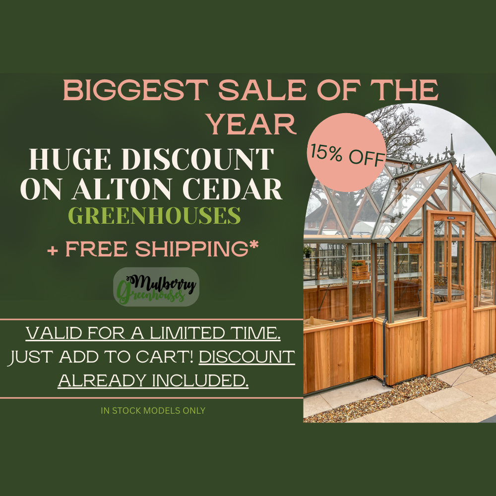 Enjoy a limited-time 15% savings on our in-stock Alton Cedar Greenhouses —...